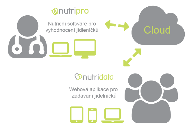 NUTRIČNÍ SYSTÉM se skládá ze softwaru NutriPro a webové aplikace NutriData.cz, které spolu komunikují prostřednictvím cloudu, který zprostředkovává přenos informací mezi terapeutem a jeho klienty - jídelníčky, vzájemné zprávy, pohybové aktivity, výpočty energií, nastavení doporučených denní dávek energie i živin, sledování glykémie, ketonémie, evidence a trendy tělesné hmotnosti, obvodu pasu, krevního tlaku, tepové frekvence, hladiny cholesterolu.